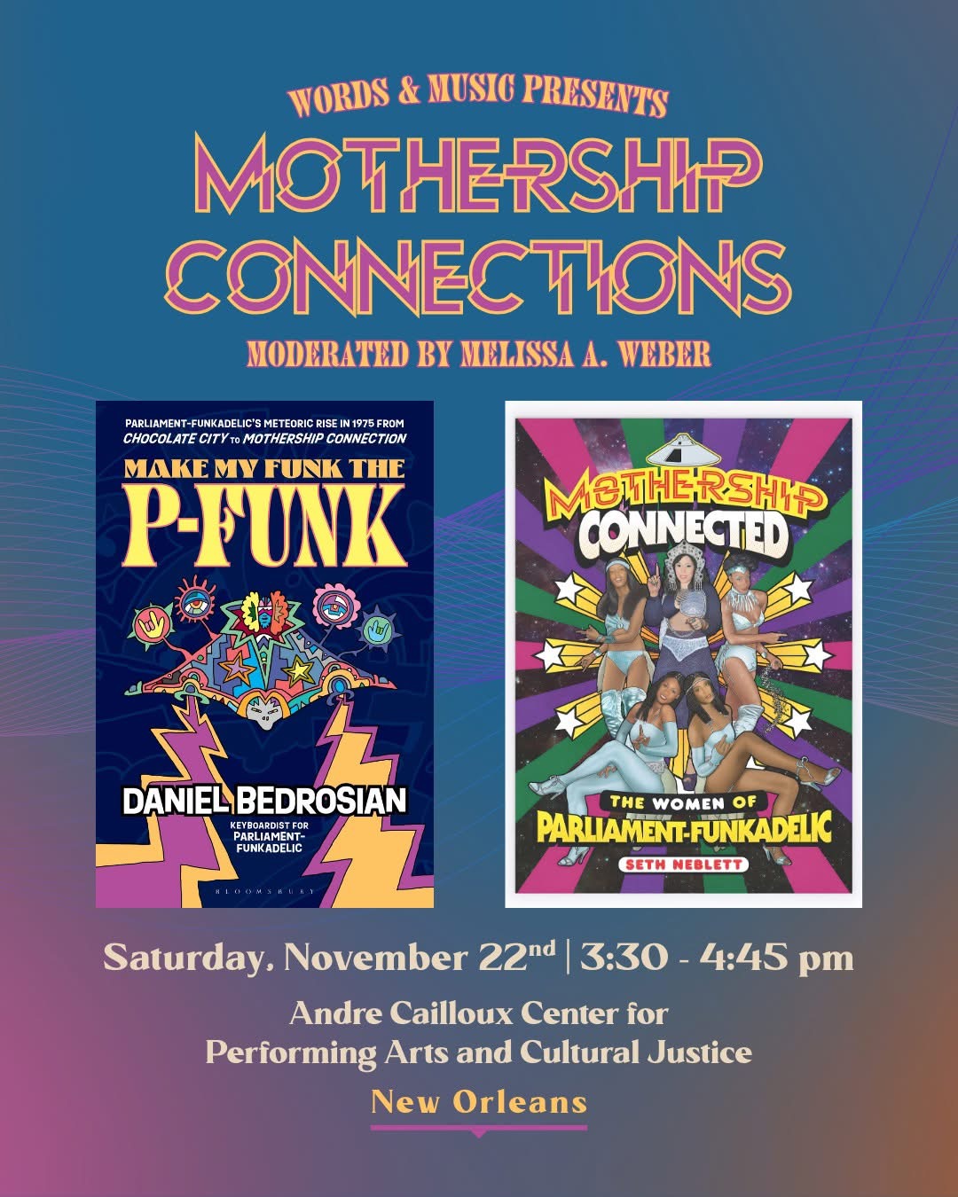 [November 22 / Moderating “Mothership Connections” book talk at Words & Music Festival, André Cailloux Center, 3:30pm – RSVP & info | flyer]